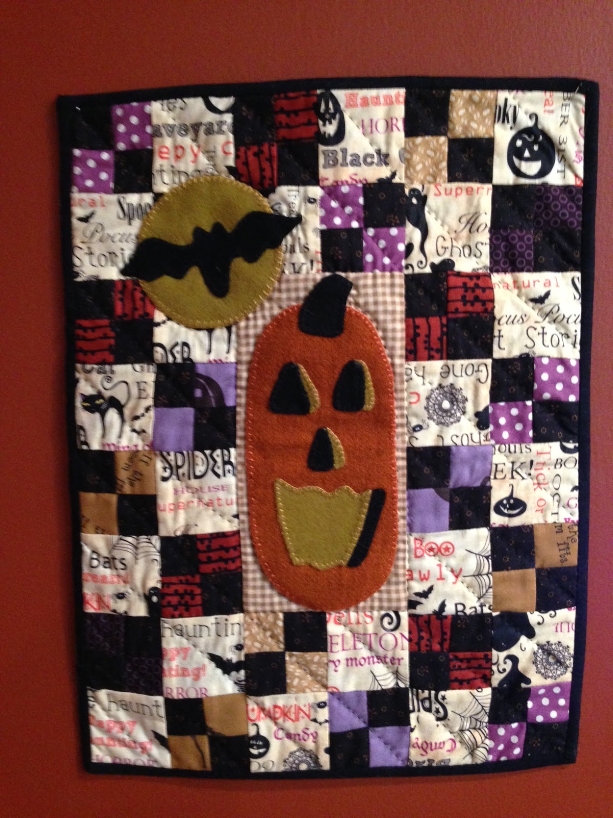 Last year I made this little quilt...but did not have it quilted and bound in time for Halloween.  It's now a finish, and I love him!